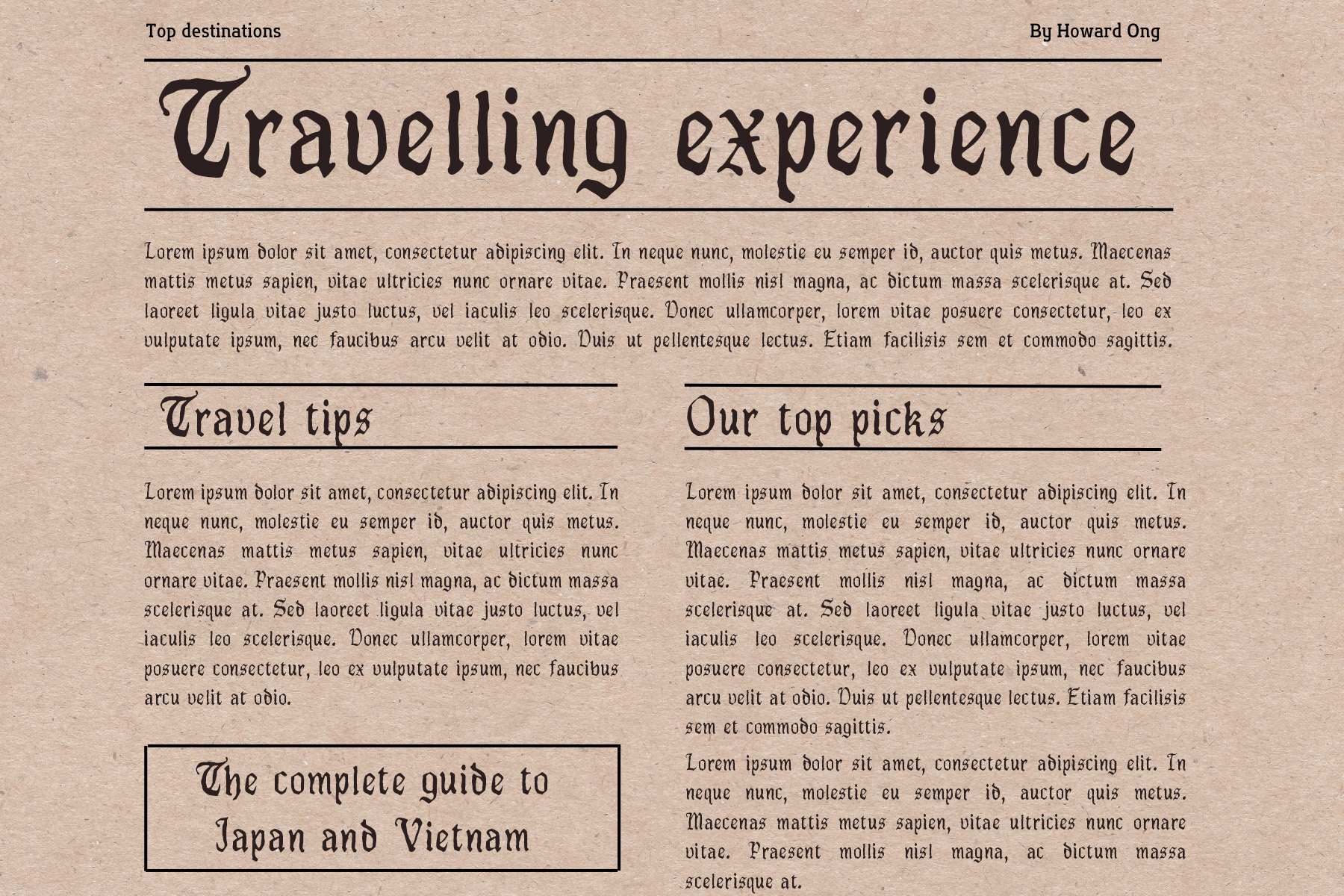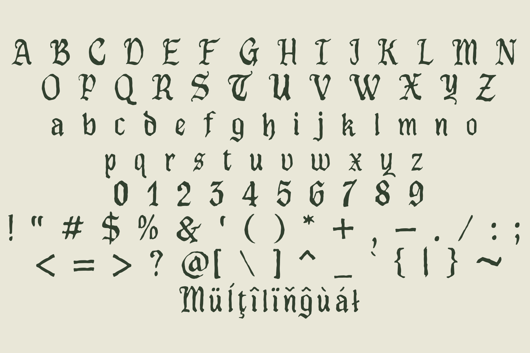 Garthion is a Blackletter typeface that embodies a strong classical spirit, inspired by medieval calligraphy traditions. With its sharp strokes, intricate details, and bold structure, Garthion evokes a sense of elegance, mystery, and historical depth.