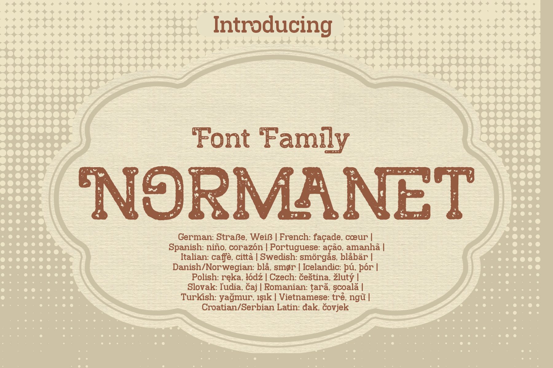 Normanet  is a vintage-inspired display typeface that blends classic charm with a warm handcrafted feel. With its textured edges and sturdy letterforms, Normanet evokes the spirit of old packaging, retro signage, and traditional print design. The slightly distressed details give the font a timeless character, making it perfect for logos, labels, posters, branding, café menus, and nostalgic-themed designs.